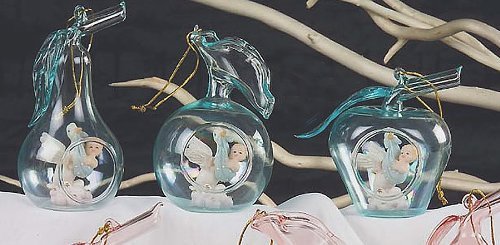 Bomboniere - Faveurs idée: bébé avec cigogne en verre bleu en forme de bulbe fruits soufflé. Hauteur 11cm